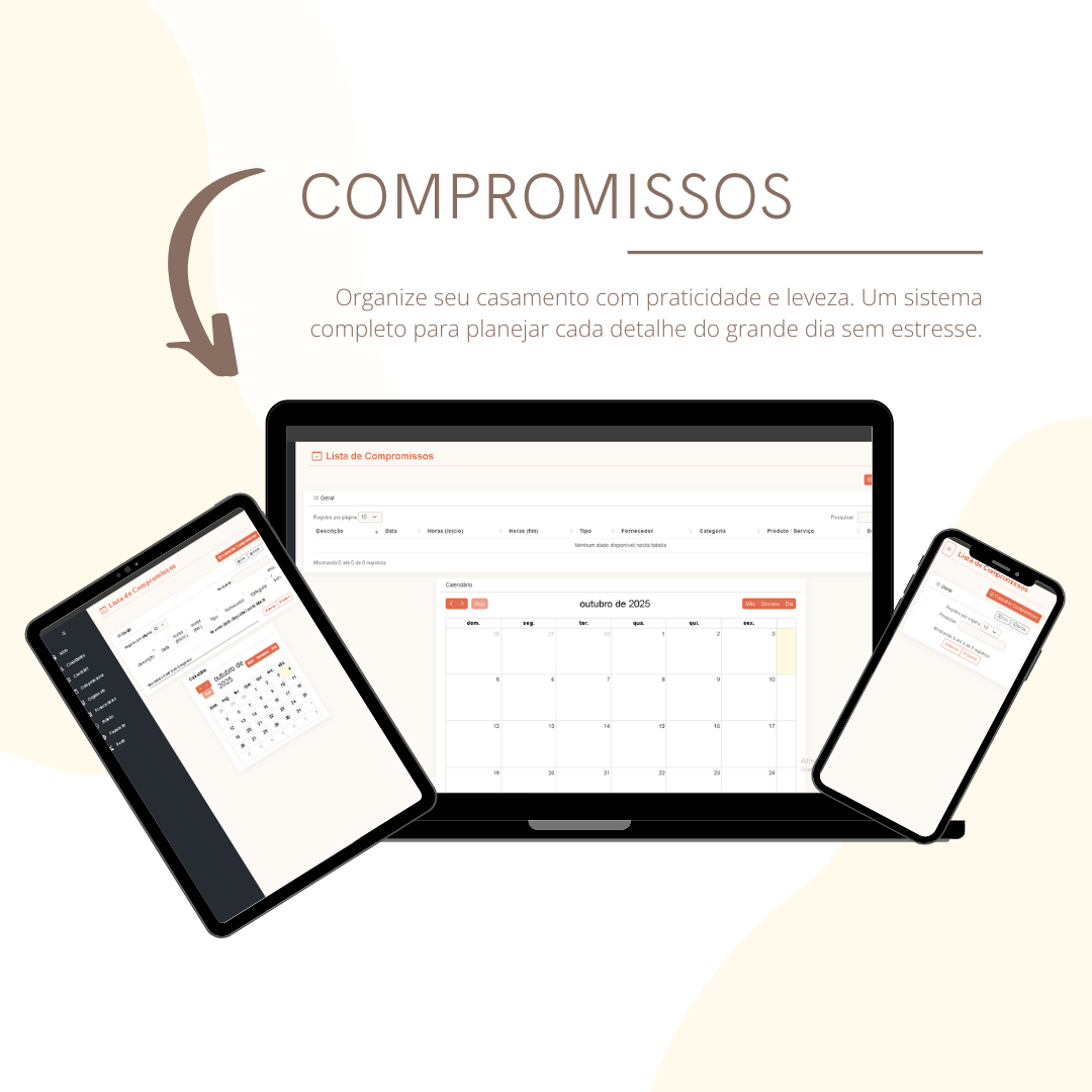 Use este espaço para registrar todas as reuniões, visitas, degustações e outros compromissos do planejamento, garantindo que nenhum detalhe seja esquecido. Antes de registrar seus compromissos, lembre-se de cadastrar seus fornecedores, assim você pode vinculá-los aos agendamentos.