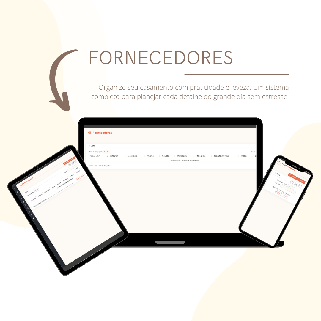 Depois de definir seus orçamentos, registre todos os fornecedores orçados e contratados. Assim você mantém todos os contatos organizados e acessíveis em um só lugar.