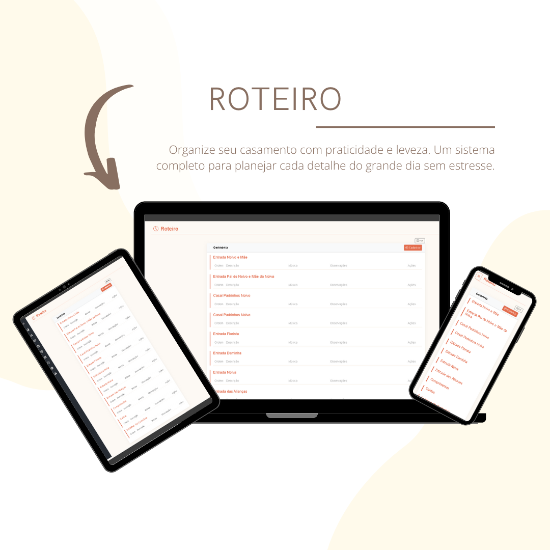 Planeje cada detalhe da sua cerimônia e recepção. Você encontrará um roteiro padrão pronto para editar, mas pode personalizá-lo para que reflita exatamente o que sonhou para o seu grande dia.