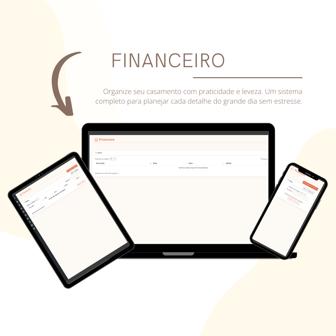 Controle completo das finanças do casamento! Registre seus pagamentos, acompanhe parcelas e mantenha em ordem todos os investimentos feitos durante a organização.