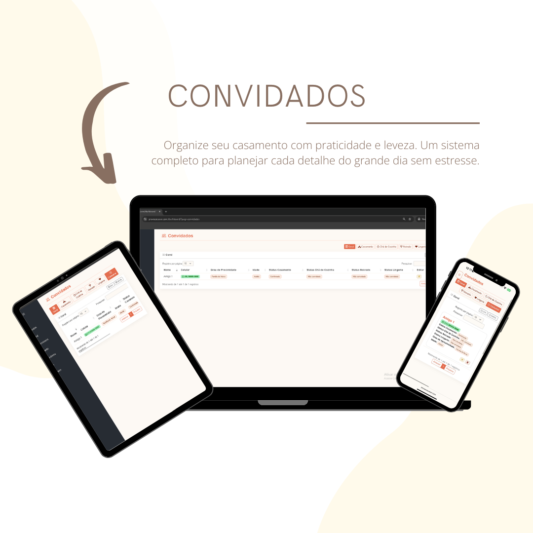 Organize a sua lista de convidados com todos os detalhes importantes: nome, telefone, idade, grau de proximidade e em quais momentos cada pessoa será chamada (cerimônia, recepção, chá, entre outros). Você também poderá controlar as confirmações de presença de forma prática e organizada enviando mensagens prontas direto para o WhatsApp.